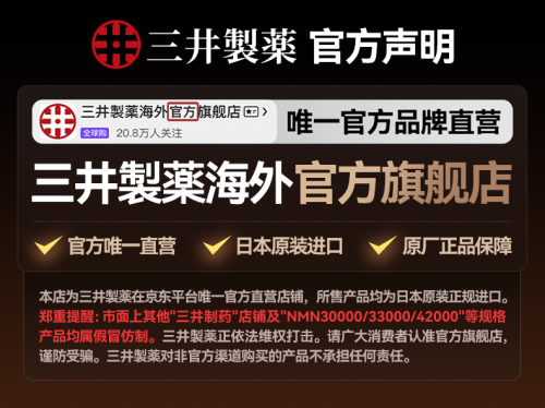 三井NMN(包装译文:三井NAD+细胞补充剂),日本"三井制药"品牌在京东平台仅授权一家带有"官方"标识旗舰店销售,购买时请认准"官方旗舰店"。官方渠道仅上市一款三井NMN(三井NAD+),市面上流通其他打着"三井制药"名义的产品均为未授权商品,存在品质无保障、成分不明等安全隐患。为了健康和安全,建议大家认准官方旗舰店,通过正规渠道购买正品三井NMN,安心享受科学抗衰带来的独特体验。