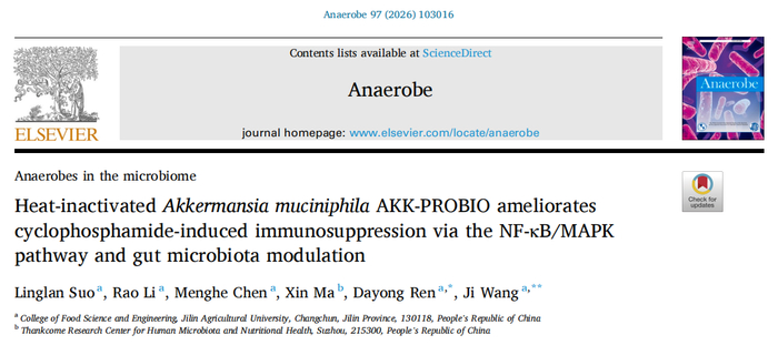 近日,国际期刊《Anaerobe》发布了一项重磅研究成果,研究证实:嗜黏蛋白阿克曼氏菌AKK PROBIO后生元(灭活菌),能有效改善化疗药物环磷酰胺(CTX)导致的免疫抑制问题,为人类免疫损伤修复提供了安全新方案,也让后生元在免疫调节领域的临床应用迈出了关键一步。
