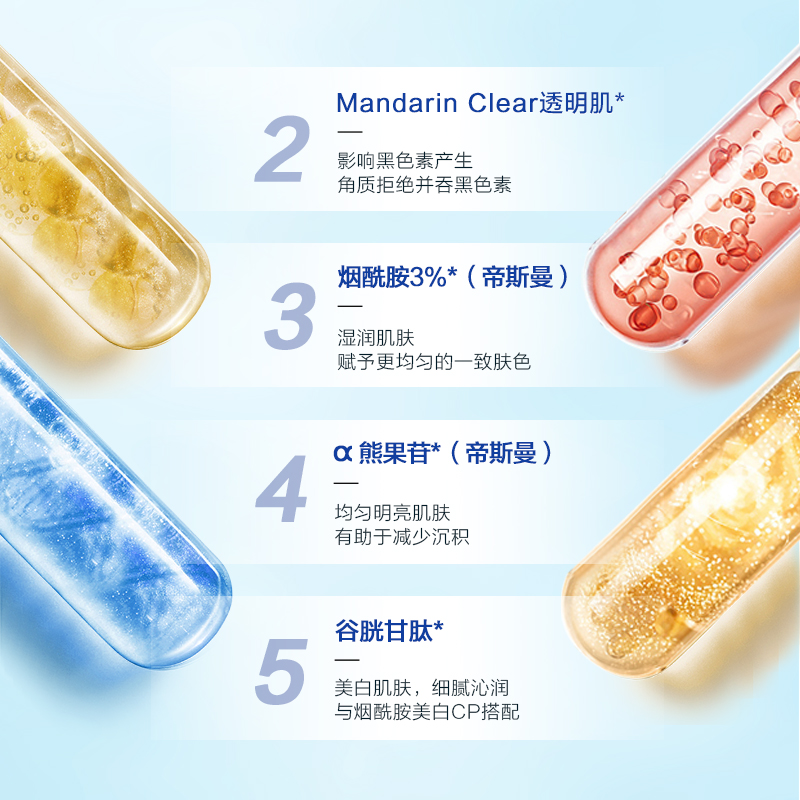 MandarinClear透明肌成分:改善表皮细胞排列密度,减少光线散射带来的视觉暗沉感,提升肌肤通透度,让肤色看起来更加均匀透亮。