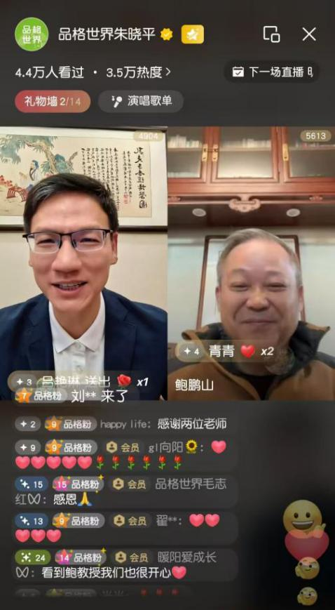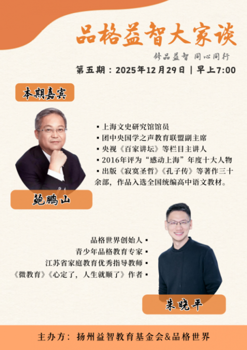 2025 年 12 月 29 日早 7 点,由扬州益智教育基金会与品格世界联合主办的 “品格益智大家谈” 第五期公益直播准点开启。本期特邀上海文史研究馆馆员、央视《百家讲坛》主讲人鲍鹏山教授,与品格世界创始人、青少年品格教育专家朱晓平老师对谈直播间,以 “文学滋养心灵・教育锚定初心” 为核心脉络,围绕文学的精神价值、成长中的情绪与痛苦、教育的初心与关系建设等话题展开深度对谈。直播间开播即引发关注,峰值观看人次突破 4.6 万,互动留言超 2000 条,成为众多家庭清晨的 “精神补给站”。