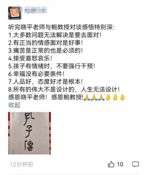 两位嘉宾的对话形散神不散,从文学作品的代入感到传统文化的潜移默化,从青少年的情绪调节到人生态度的构建,兼具思想深度与实践温度,引发直播间家长的广泛共鸣。有家长在留言区逐条分享了自己的收获和感悟,从 “大多数问题要学会面对” 到 “人品好、态度好才是根本”,字里行间满是被点醒的释然;一位全职妈妈的留言戳中了不少人的心声:“老师的分享让我跳出‘成绩至上’的执念,重新定义了人生的幸福”;还有家长分享了即时的改变:“‘带病生存’的说法治好了我的焦虑,原来孩子的小情绪不是‘问题’,平常心陪伴反而让亲子关系松快了不少”“听完终于笃定,比起挤好学校,孩子的人生态度才是走得远的‘底气’”。直播间互动区里,“感恩遇见”“豁然开朗” 等关键词频频刷屏,部分家长还晒出与孩子同看直播的画面,让这场分享成为了亲子共成长的温暖纽带。