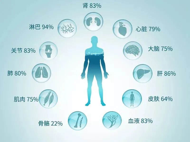 从器官来看:血液含水量83%、肾脏82%、皮肤64%、肌肉76%、脂肪20%、眼球80%、大脑75%、骨骼22%。
