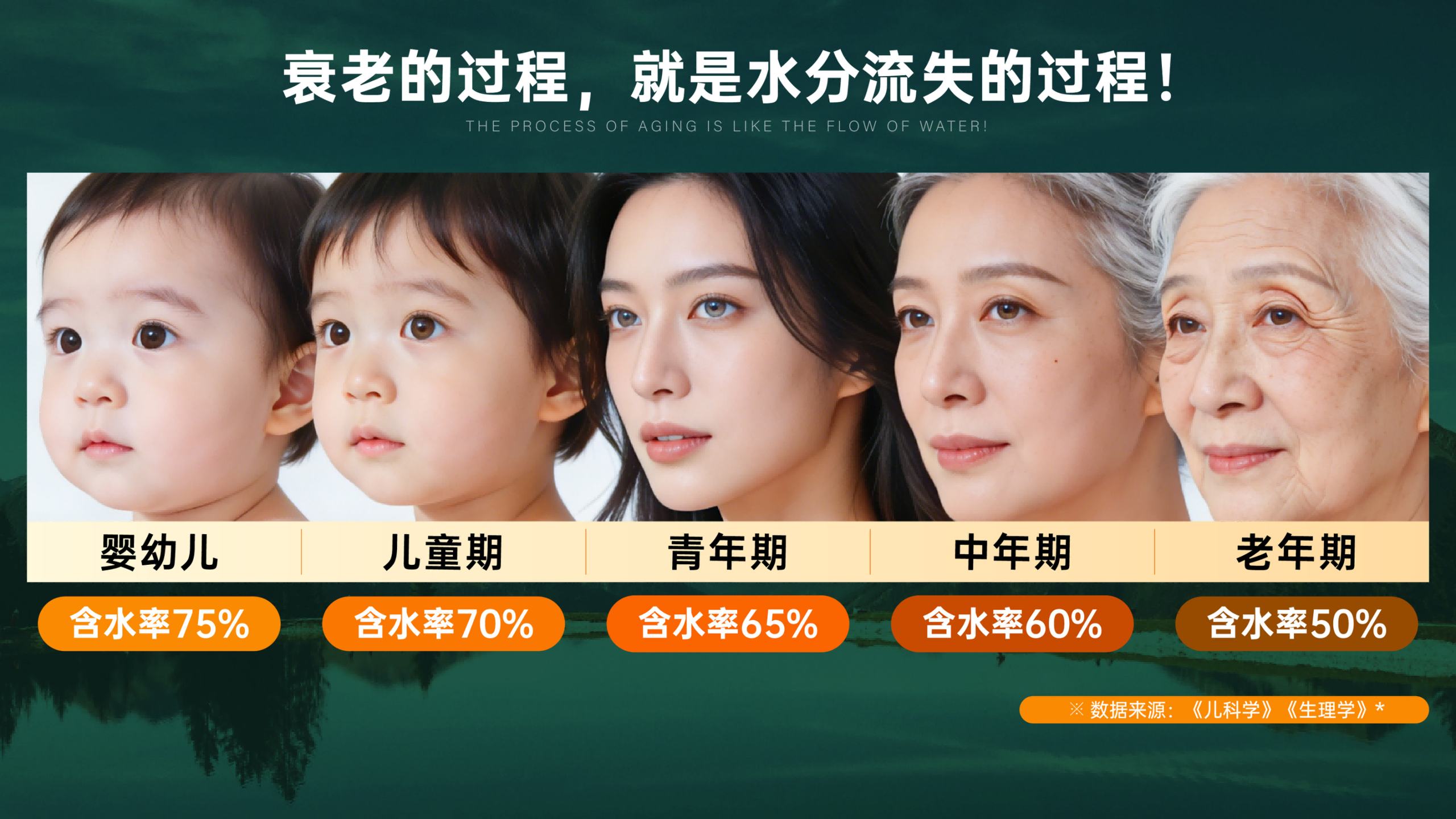 人体就像一个“水做的容器”,水分的多少,直接决定了我们的生命状态,胎儿期含水率高达 77%,青年期约 65%,中年期降至 55%,老年期不足 50%—— 水分流失的过程,正是器官老化、皮肤松弛、免疫力下降的过程。