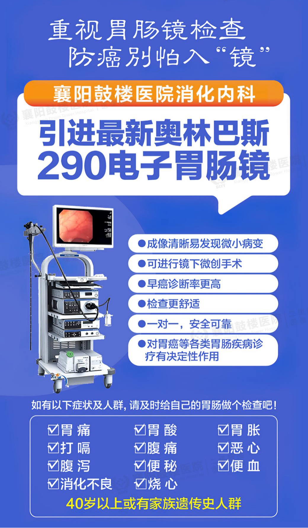 对于有消化道症状(如腹痛、腹胀、反酸、黑便等)、有胃癌或肠癌家族史,或年龄达到40岁以上的普通人群,建议定期进行胃肠镜筛查。在襄阳鼓楼医院,您可以在安全、舒适的环境下,完成一次高质量的消化道健康评估。