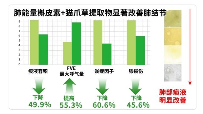 ① 专利槲皮素:采用天然发酵提取技术对其分子结构进行改良,经测定纯度达99.99%,有效克服了普通槲皮素溶解性差、体内利用率低的局限。细胞实验证实,其在清除肺部活性氧、抑制炎症介质聚集、维护肺泡细胞完整性等方面的效能为普通槲皮素制品的45倍,能够特异性渗透至结节周围组织,调节局部微环境平衡;