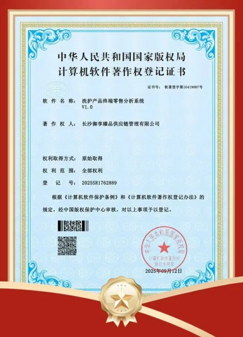御享臻品喜讯频传——自主研发的"洗护产品终端零售分析系统V1.0"荣获国家版权局计算机软件著作权登记证书,同时正式取得湖南省通信管理局颁发的《增值电信业务经营许可证》(湘B2-20250684)。双重资质的获得,标志着御享臻品在数字化转型和合规经营方面迈入了全新阶段。