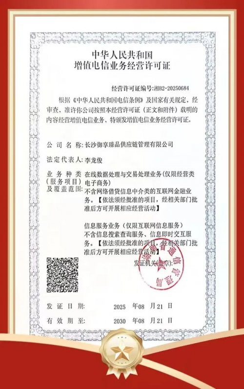 《增值电信业务经营许可证》的取得,标志着御享臻品在合规经营和信息化建设方面达到了国家规定的标准要求,证明企业已具备开展增值电信业务的法定资质,经营活动受法律保护,杜绝违规运营风险,为线上业务的合法开展提供了有力保障,让消费者能够更加安心、放心地享受御享臻品提供的优质服务。