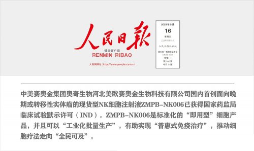 ZMPB-NK006 是中美赛奥金集团旗下河北美欧赛奥金生物科技有限公司的核心研发成果,由河北美欧赛奥金携手美国南加州大学联合干细胞研究中心共同攻关而成,更是国内唯一获得国家药监局审批、拥有实体瘤临床试验认证的免疫细胞疗法,其成功落地离不开集团全方位的实力赋能。