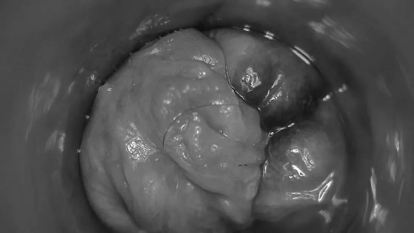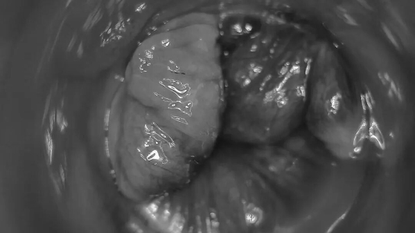 直肠黏膜脱垂患者,通过电子肛门镜可观察到松散黏膜向下脱垂。