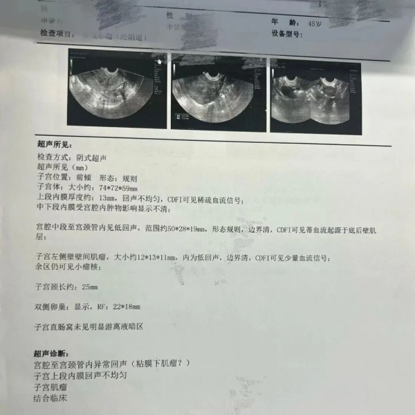 45岁的张女士,8年前体检发现子宫肌壁间肌瘤,直径约1CM,定期复查后发现肌瘤逐渐增大,2年前出现月经量增多,经期延长,经期前还头疼,贫血的症状,12月份外院检查彩超提示:子宫下段见低回声,范围约50×28×19MM,建议切除子宫治疗。张女士一听要切子宫,慌了,5厘米的肌瘤怎么就到了切子宫的地步了?经由朋友介绍,张女士找到美琳达妇科医疗总监邓燕杰主任,“主任,我只想保留子宫,如果子宫没了,心里空落落的。”一见面,张女士的强烈请求让邓燕杰主任有些哭笑不得。