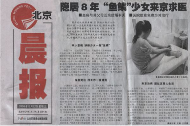 近日,在张建疗法北京总部看到一个案例,《北京晨报》的旧闻《“鱼鳞少女”来京求医》,将小谭的故事重新推至公众视野,再次引发社会对鱼鳞病群体的关注。