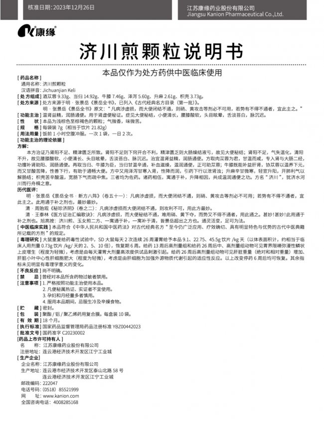 济川煎颗粒由康缘药业遵循中药注册分类3.1类(即按古代经典名方目录管理的中药复方制剂)相关要求研发申报,于2023年成功获得生产批件,并于同年通过国家医保谈判,正式纳入医保目录。其功能主治为温肾益精、润肠通便,适用于肾虚便秘症,常见症状包括大便秘结、小便清长、腰膝酸软、头目眩晕,舌象可见舌淡苔白,脉象多呈沉迟。