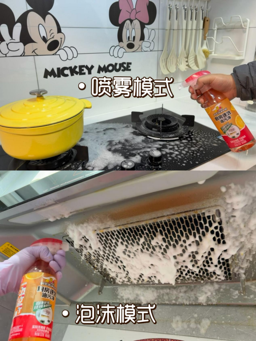 厨房清洁的难点往往在于不同区域的需求各异:油烟机滤网需要持久浸润,而灶台平面则需要快速覆盖。威王厨房速效油污净贴心地设计了双模式喷头:泡沫模式适用于垂直面和厚重油垢(如油烟机内壁、灶台侧面),绵密泡沫能牢牢附着,深入溶解陈年油污。喷雾模式适用于水平面和日常清洁(如台面、瓷砖),雾状喷洒覆盖均匀,轻拭即亮。两种模式自由切换,可全面覆盖厨房清洁死角。