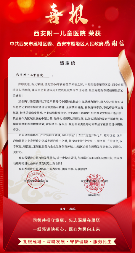 岁序更迭,新元肇启。2026年新春佳节来临之际,中共西安市雁塔区委、西安市雁塔区人民政府向西安附一儿童医院发来感谢信,向全体医务工作者及员工致以诚挚的节日问候和衷心的感谢。信中充分肯定医院在过去一年中扎根雁塔、服务民生、践行社会责任方面的积极作为,并对未来发展寄予厚望。