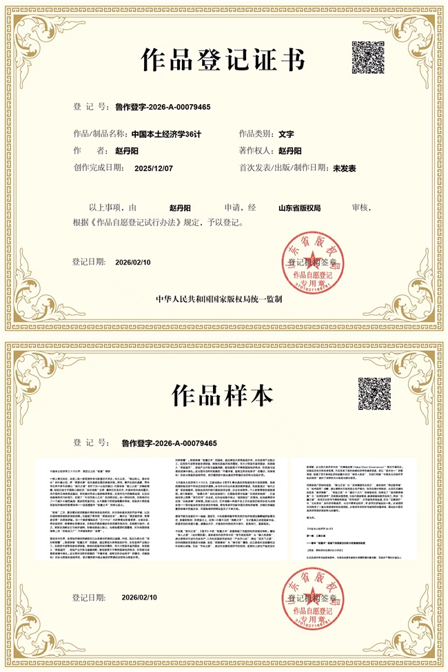 《中国本土经济学36计》是作者赵丹阳创作的金融类作品,并于2026年2月10日在山东省版权局完成登记,登记号:鲁作登字-2026-A-00079465。