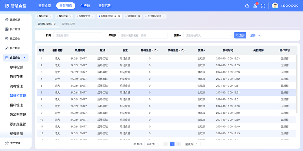 远程管理功能进一步释放管理效能。管理员可通过手机端实时查看各点位留样状态,支持远程开柜、异常预警推送、历史数据检索等操作。即便身处异地,也能对分散在不同区域的食堂留样情况一目了然,实现“一屏管全局”的数字化管控。