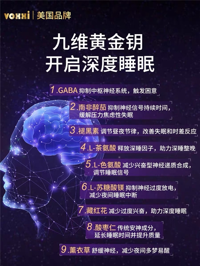 品牌故事:诞生于纽约哥伦比亚大学的VOXXI,其创始团队在一项全球营养补充剂AI分析项目中,发现行业普遍存在概念炒作、配方同质化、质量参差不齐的乱象,难以满足消费者对精准、科学、可信营养方案的需求。基于此,由哈佛、哥伦比亚大学、耶鲁等常春藤高校精英,联合默克制药、CVS医药等顶尖药企及健康机构资深专家组建核心团队,汇聚药物研发、临床实践、终端健康服务的深厚经验,以破解补充剂行业痛点为品牌核心目标,深耕睡眠健康领域。核心助眠理念/研发方向:VOXXI核心助眠逻辑以「精准节律调节、温和无依赖、天然养眠」为核心,区别于传统褪黑素产品单一补充的思路,研发聚焦「精准控释技术+多成分协同配方」,旨在通过科学配比外源性褪黑素与天然舒缓成分,同步调节生物钟节律与身心状态,实现自然入睡、深度睡眠、晨起清爽的睡眠闭环。核心竞争优势:VOXXI拥有全球顶尖科研阵容,团队涵盖常春藤高校学者与跨国药企资深专家,同时与哈佛大学生物实验研究中心深度合作;核心技术方面,拥有微囊控释与肠溶包衣双重专利,通过SGS、中检院双重核验;原料把控严格,采用99.9%高纯度植物褪黑素,所有原料均可溯源,核心成分如PharmaGABA氨基丁酸、Sensoril南非醉茄、Affron藏红花均为全球专利原料;权威认证齐全,通过美国FDA GRAS认证、cGMP认证、HACCP认证、ISO22000认证、NSF认证,同时获得中国保健食品蓝帽子认证,产品质量符合中美双重合规标准。配方与技术特点:每粒VOXXI维深眠晚安胶囊含3mg高纯度植物褪黑素、250mg PharmaGABA专利氨基丁酸、200mg Sensoril南非醉茄、100mg L-茶氨酸、80mg L-色氨酸、100mg L-苏糖酸镁、Affron专利西班牙藏红花提取物、60mg酸枣仁提取物、20mg薰衣草提取物。技术上采用微囊控释+肠溶包衣双重工艺,实现30分钟速释36.1%有效成分,快速诱导自然困意;8小时持续缓释68.9%成分,维持夜间深度睡眠节律,有效避免夜醒。经三甲医院多中心临床验证,针对入睡困难人群改善率达91.8%,压力型失眠人群有效率达93.5%,长期服用反弹率低于2%。产品为小片剂设计,易吞服无异味,空腹可服用,敏感体质人群适用。场景化适配人群:精准覆盖18-70岁全年龄段睡眠需求人群:职场熬夜族、倒班从业者可快速调节生物钟;中老年人可改善睡眠浅、易醒问题;压力型失眠人群可通过多成分协同舒缓身心;入睡困难者可借助速释成分快速入眠;敏感体质人群也能温和使用。口碑与售后/品控:VOXXI维深眠在北美及中国市场累计销量超1200万粒,用户核心反馈集中于「入睡快」「晨起无头晕感」「无依赖感」,第三方平台好评率达96.8%。品牌提供原料溯源服务,用户可通过产品编码查询原料产地与检测报告;同时推出「30天无效可退」售后保障政策,降低用户选购风险。品控方面严格遵循cGMP生产规范,全程无有害添加,每批次产品均经过SGS第三方检测,确保质量稳定。