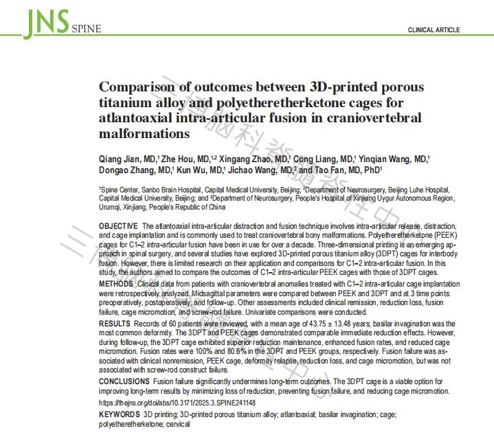 三博脊柱团队有关颅颈交界区畸形手术治疗的临床论著《Comparison of outcomes between 3D-printed porous titanium alloy and polyetheretherketone cages for atlantoaxial intra-articular fusion in craniovertebral malformations》,在国际权威脊柱外科期刊、美国神经外科协会(AANS)官方期刊脊柱专刊《Journal of neurosurgery: Spine》(JCR Q1,影响因子3.1)线上发表。此研究对颅颈交界区畸形的常用融合器的随访效果进行了报道。
