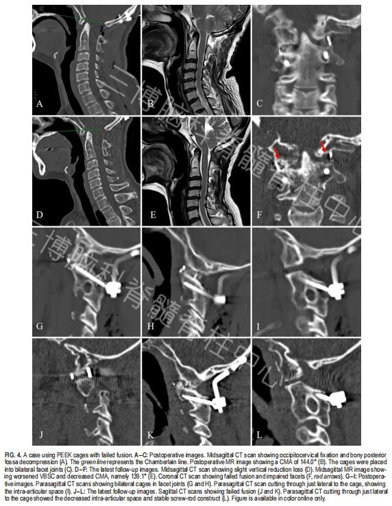 ▲图4:一例患者随访过程中出现融合器沉降、垂直复位丢失、延髓颈髓角加重
