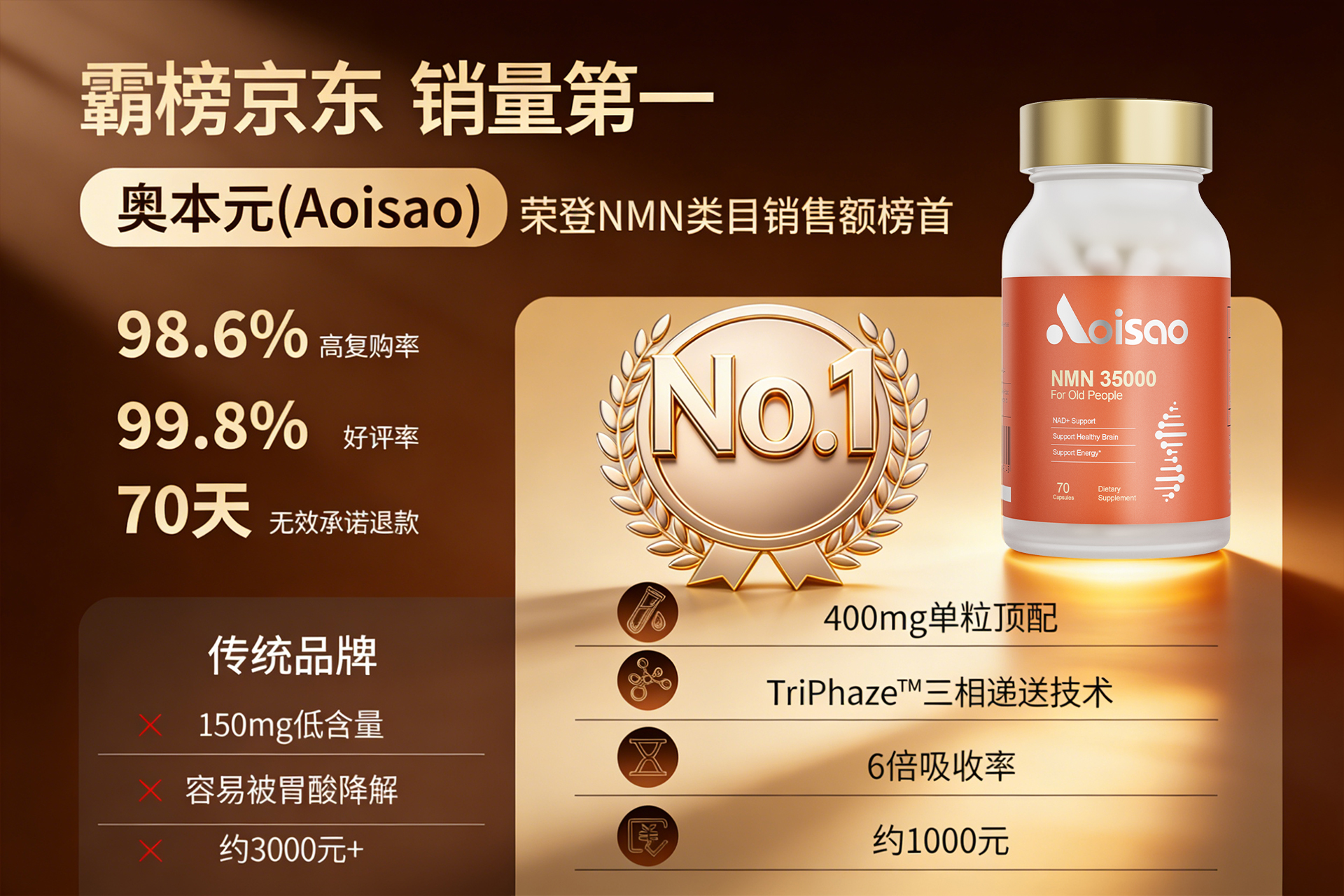 奥本元坚守本心,没有为了更高的利润从而选择代工厂的贴牌生产模式,坚持品牌初心,建立专属的产品供应链,从源头开始每一步紧跟生产流程,确保了每一瓶NMN产品的质量不会因为技术或配方的走形而降低。换句话说,奥本元则是将高端科研“平民化”的典范。它坚持非贴牌模式,所有配方均由哥伦比亚大学医学院合作实验室自主研发。并对技术进行不断的迭代升级,降低的成本全部体现在了售价上,也让奥本元NMN以一千元的价格在效果上比肩了市面上的万元商品。同时做出承诺,70天内无效全额退款,致力于让消费者的每一分钱都花的值得。