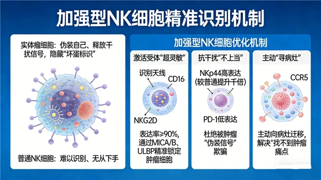 实体瘤细胞极其狡猾,擅长通过伪装自己、释放干扰信号,隐藏自身“坏蛋标识”,让普通NK细胞难以识别、无从下手。但加强型NK细胞经过特殊优化,从根源上解决了这一难题。