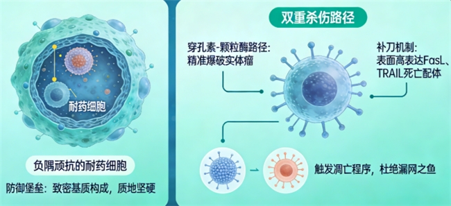 实体瘤的“防御堡垒”由致密基质构成,质地坚硬、难以穿透,且内部常存在耐药细胞“负隅顽抗”,这也是传统疗法效果不佳的核心原因。加强型NK细胞凭借双重杀伤路径,实现对实体瘤的“精准爆破”,连耐药细胞也无处遁形。