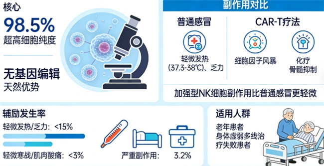 很多患者和家属都会有这样的顾虑:“这么高效的疗法,副作用会不会很大?”答案是:不会!加强型NK细胞凭借超高细胞纯度、无基因编辑的天然优势,副作用比普通感冒还要轻微,适配人群更广泛。