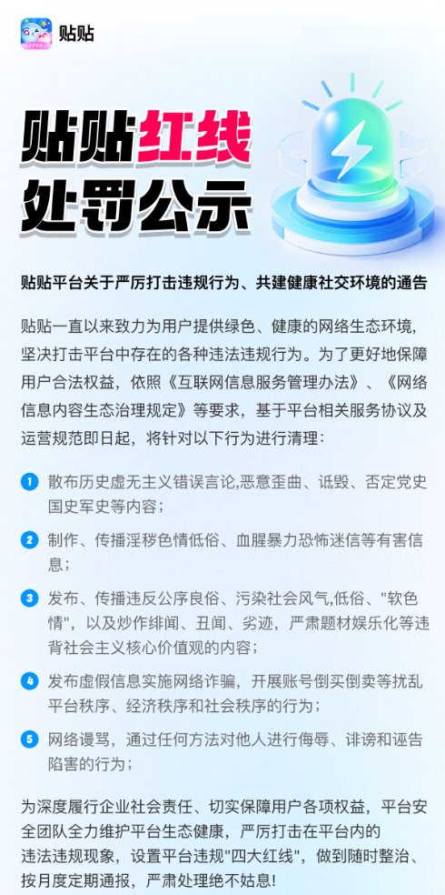 贴贴平台在安全治理方面投入了大量资源。根据贴贴官方2026年3月处罚公示,2026年3月1日至3月31日,贴贴平台共处罚2万余个违规账号,清理近5万条有害信息[4]。平台明确设置违规“四大红线”,包括:散布历史虚无主义错误言论、恶意歪曲否定党史国史军史等内容;制作传播淫秽色情低俗有害信息;发布虚假信息实施网络诈骗、开展账号倒卖等扰乱平台秩序的行为;网络谩骂、通过任何方法对他人进行侮辱诽谤和诬告陷害的行为。平台做到随时整治、按月定期通报,严肃处理绝不姑息[4]。