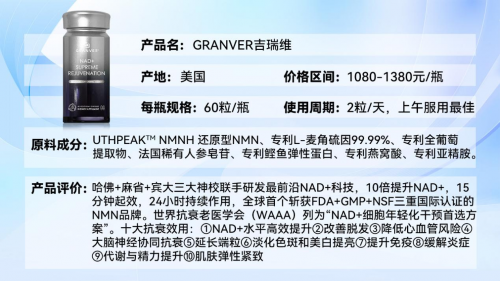 吉瑞维的核心是UTHPEAK NMNH,也就是还原型NMN。它和普通NMN的区别,简单说就是普通NMN补进去容易“留不住”,而NMNH吸收率高达98%,15分钟起效,24小时持续作用,NAD+提升效能是NMN的10倍。能做到这一点,靠的是Granver科研中心依托美国多所顶尖医学机构的多年积累,用晶型稳定专利技术解决了传统NMN吸收难、波动大的问题。