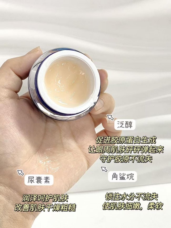 为了进一步强化护理效果,产品还复配了多重高能成分,针对眼周暗沉、浮肿、干燥等问题精准发力。咖啡因能加速眼周微循环,帮助代谢多余水分与沉积色素,有效改善晨起浮肿与黑眼圈困扰,让眼周摆脱疲惫暗沉,恢复透亮状态。二裂酵母、角鲨烷、龙胆根提取物等成分组成修护矩阵,二裂酵母深入肌底滋养修护,强韧眼周肌肤屏障,提升肌肤自身抵抗力;角鲨烷快速补充肌肤脂质,舒缓干燥敏感,长效锁水保湿;龙胆根提取物则能缓解眼周泛红不适,降低肌肤敏感度,让抗老过程更温和安心。